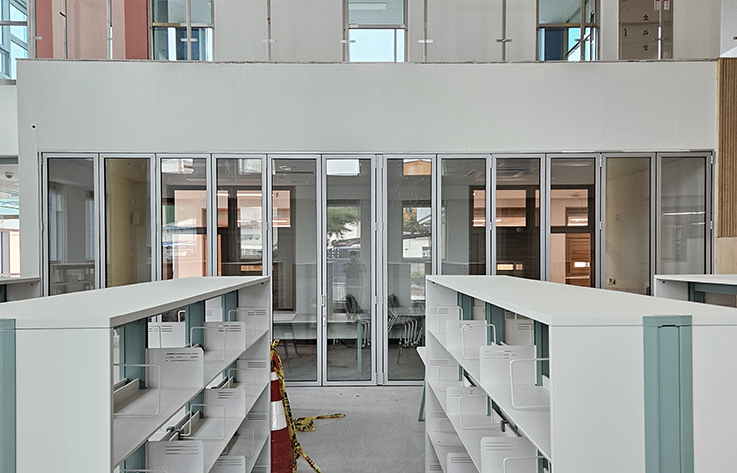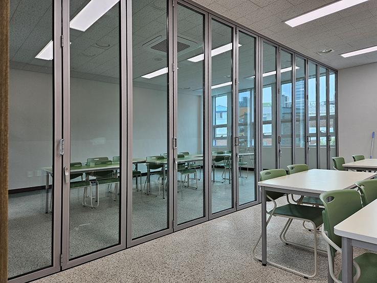 In particular, the reinforced glass folding door was applied to increase durability while maintaining lighting and openness, and the low-level lower rail structure considered the safety of students' movement.