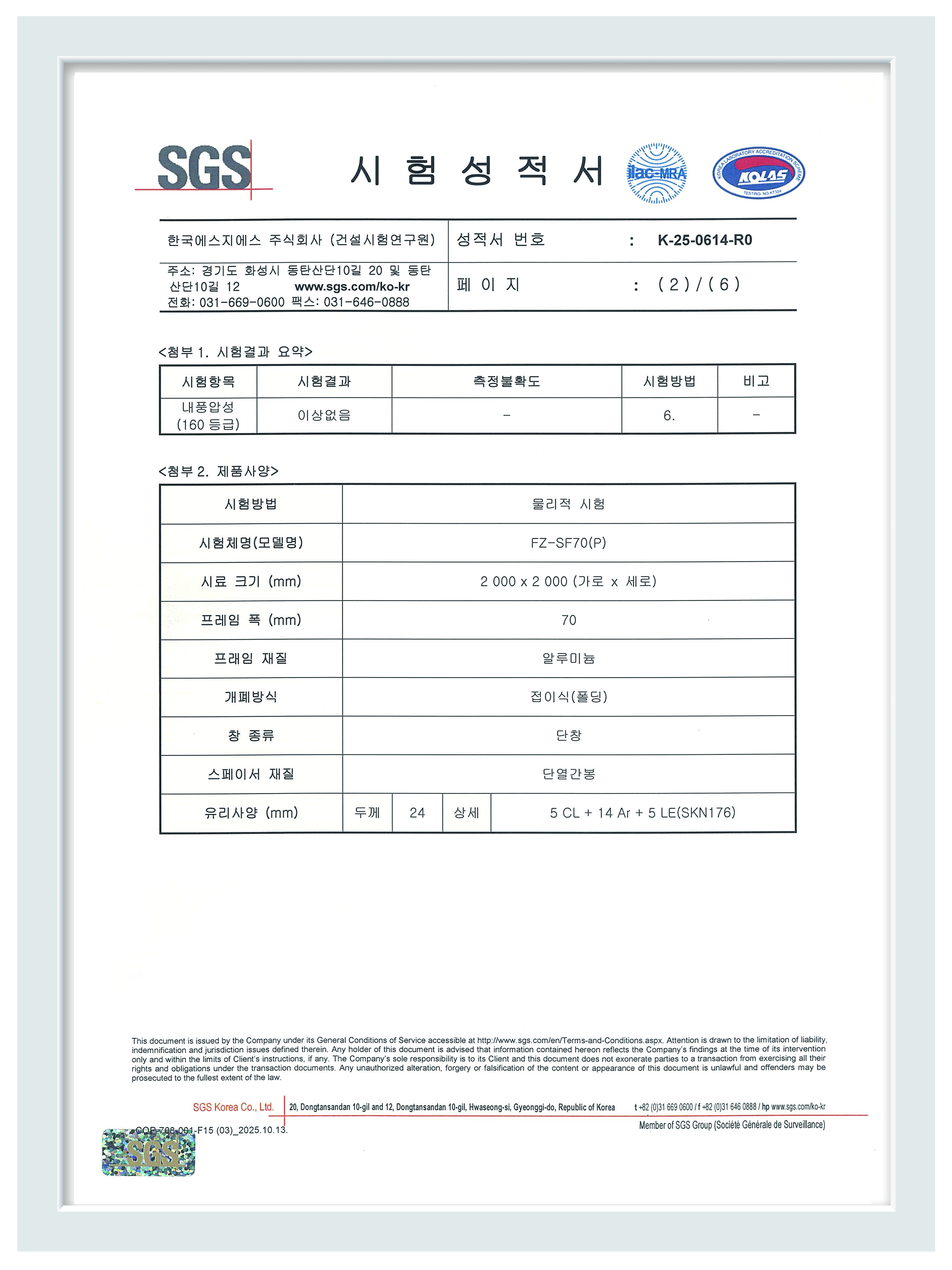 Folzen Korea has obtained a 70mm insulation folding door heat flow rate of 1.095 and wind pressure of 160!!
