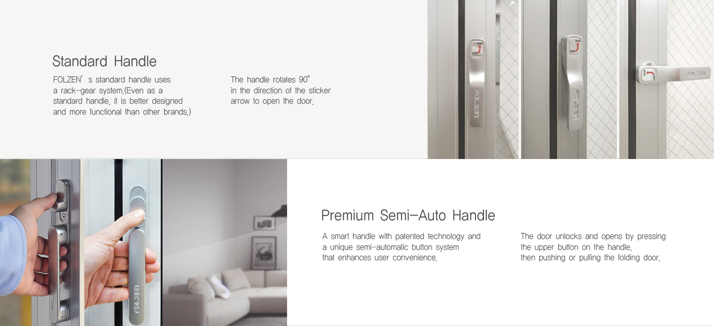 Innovation in folding doors! The FOLZEN KOREA Premium Semi-automatic Handle (Easy Handle) enhances the convenience of using folding doors. This product was developed to improve the inconvenience of existing folding door handles, providing users with a more convenient, safe, and aesthetically satisfying experience.