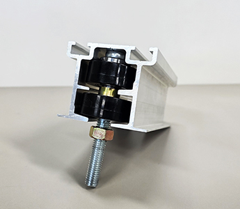 Wheel (roller) device that moves the moving wall panel along the upper rail. Provides smooth and stable movement while supporting weight