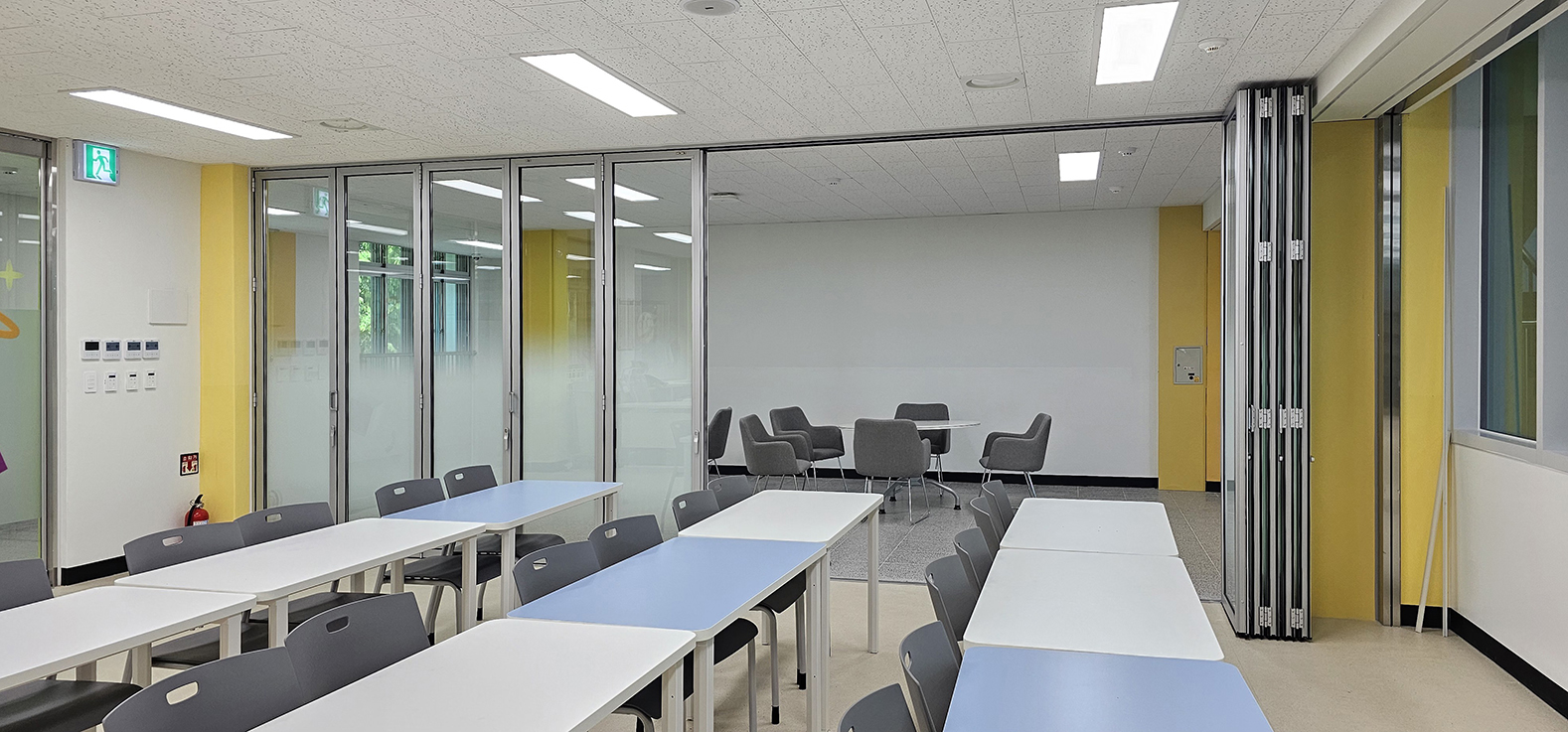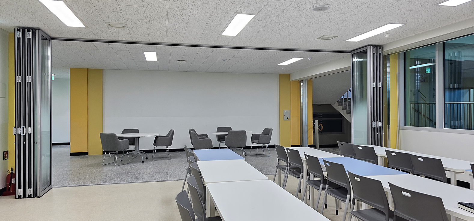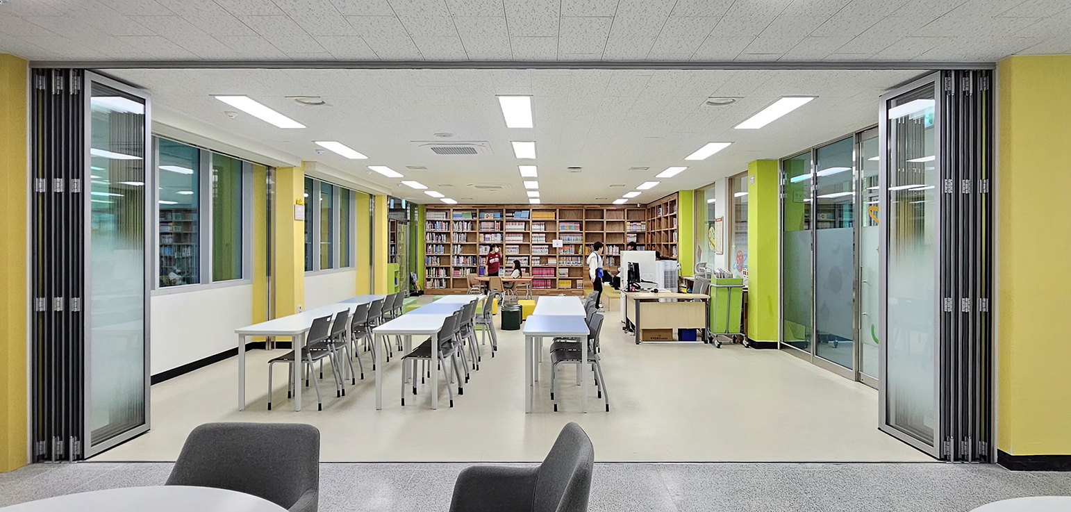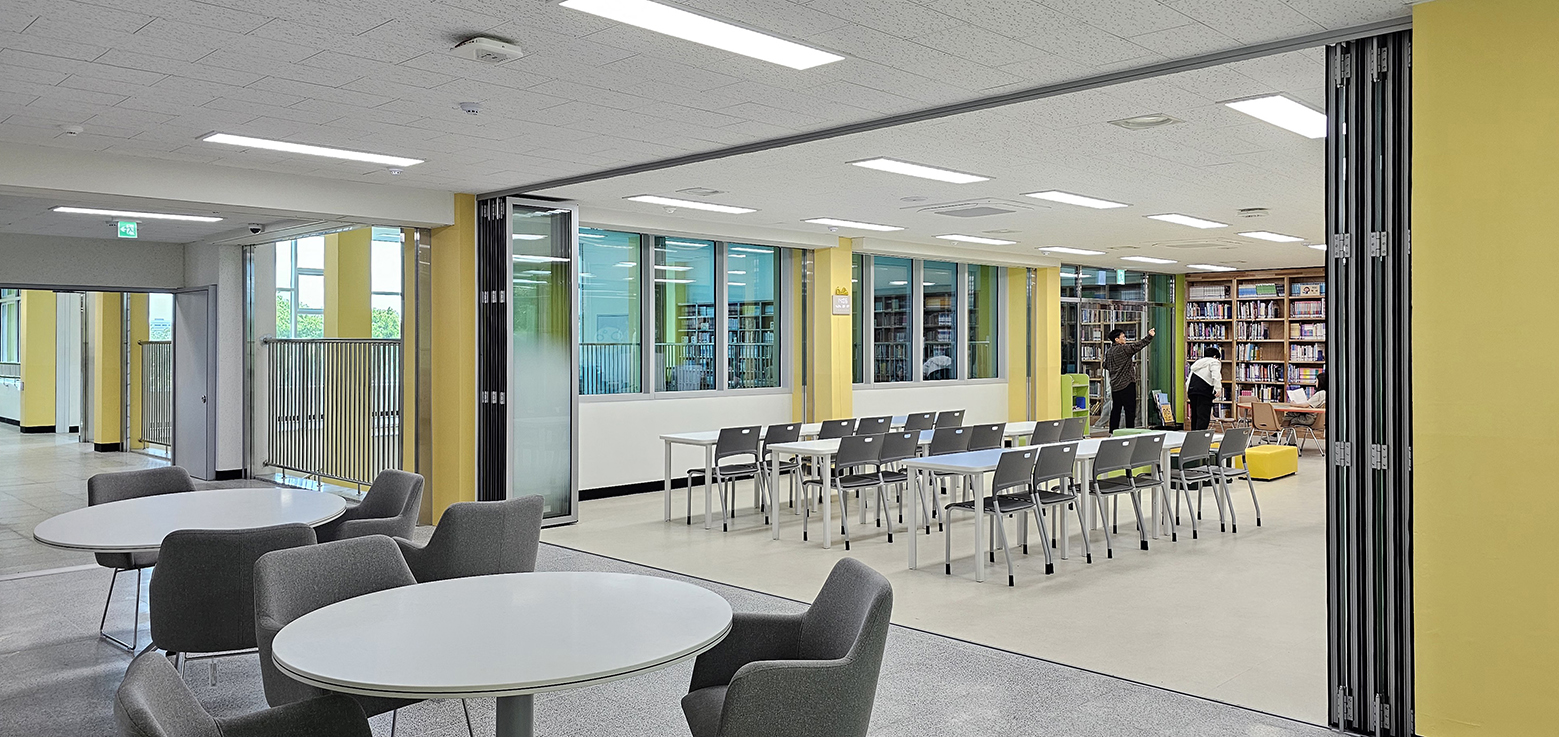 폴딩도어를 적용하여 공간을 유연하게 개방하거나 분리할 수 있도록 구성하였으며, 필요 시에는 열린 구조로 쾌적하고 확장된 독서 공간을 연출할 수 있습니다.