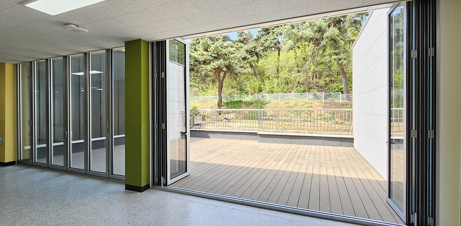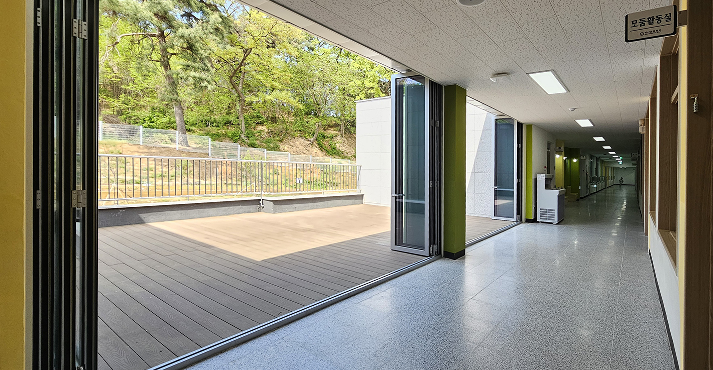 폴딩도어를 적용하여 입구 공간을 필요에 따라 개방하거나 분리할 수 있도록 구성하였으며, 개방 시에는 자연스럽게 연결된 활동 공간을 형성하고, 닫았을 때는 독립된 학습 및 활동 공간으로 구분되어 효율적인 수업 운영이 가능하도록 하였습니다.