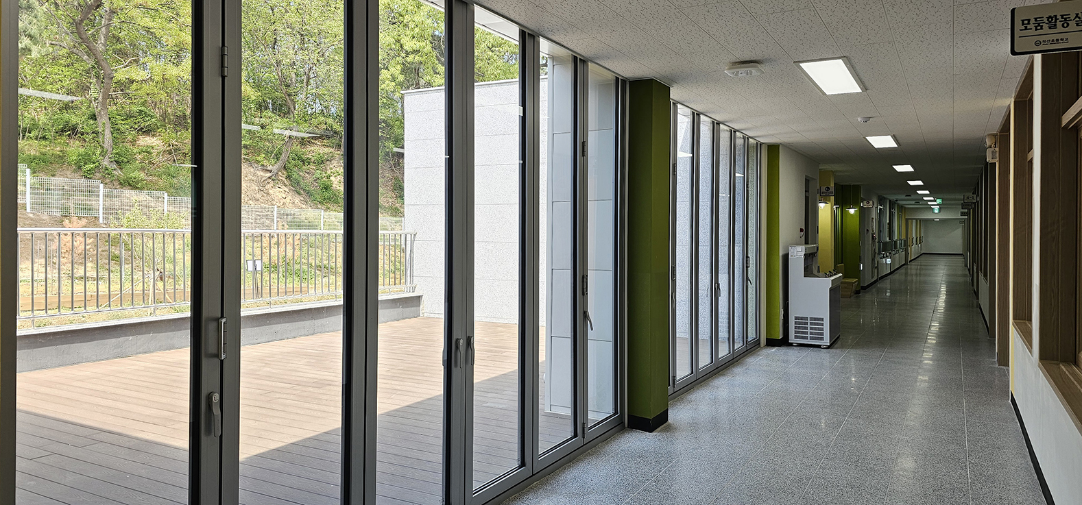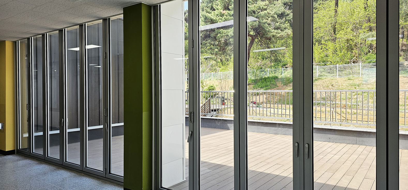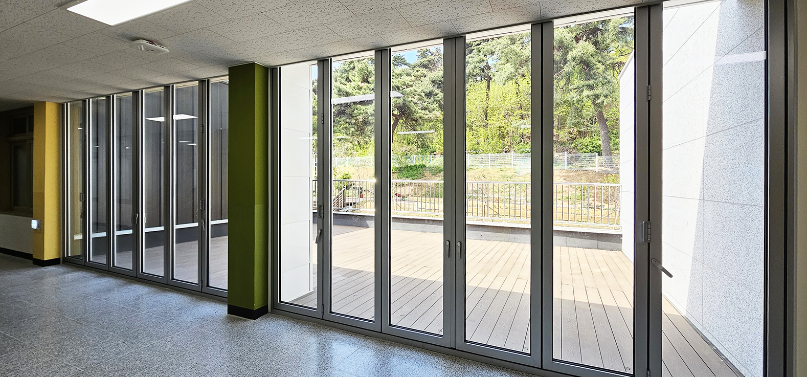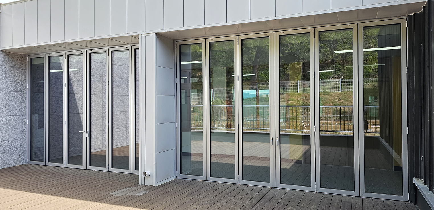 천안 직산초등학교 모둠활동실 입구에 폴젠코리아 폴딩도어를 시공했습니다.