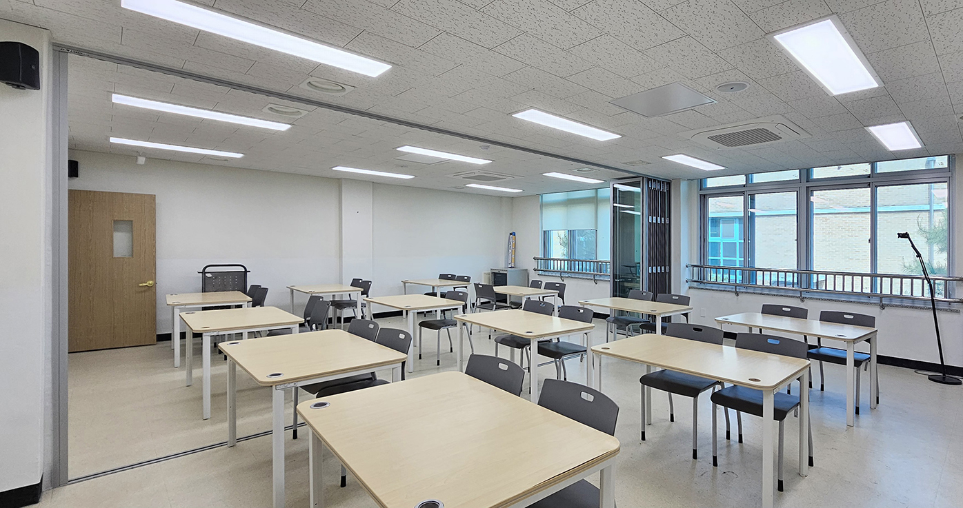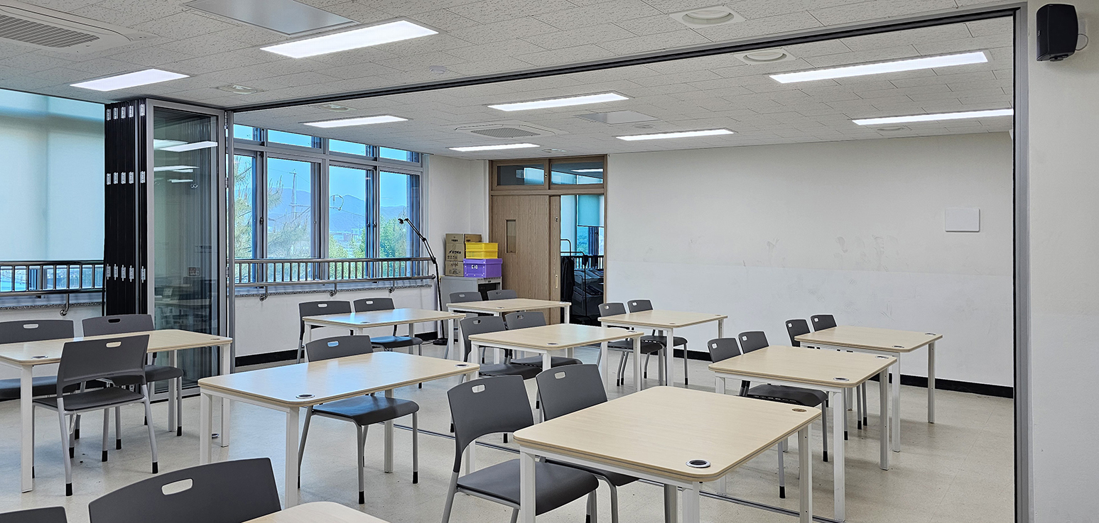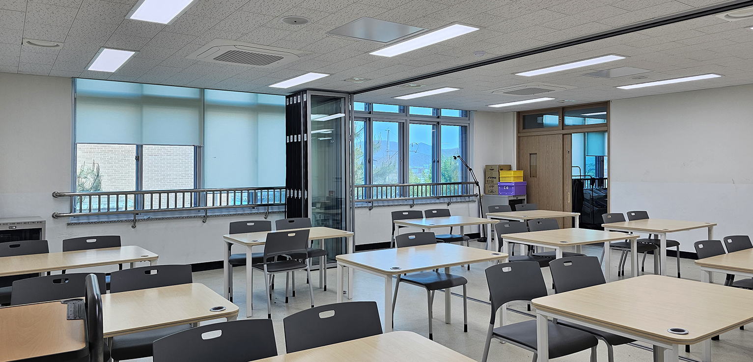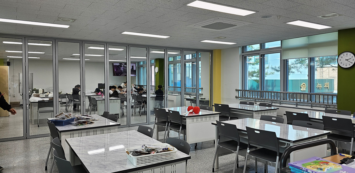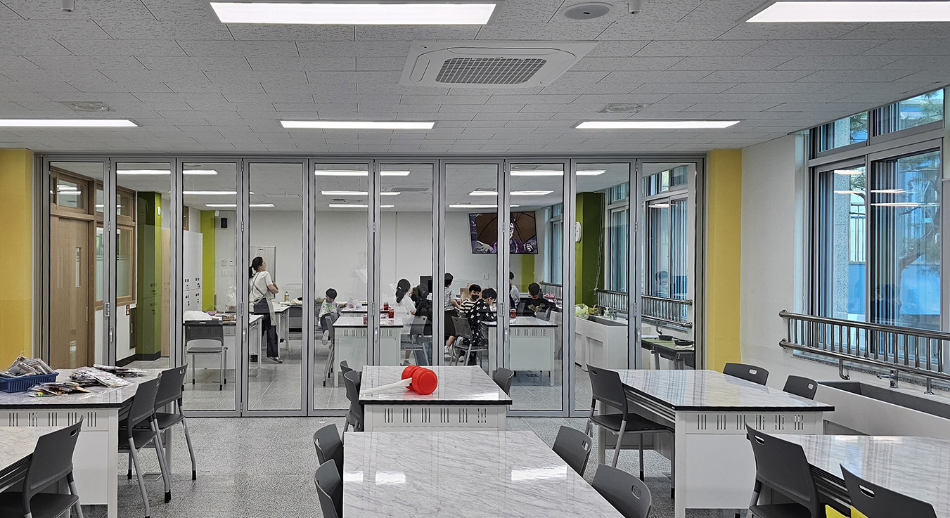 폴딩도어를 적용하여 필요에 따라 교실 공간을 개방하거나 분리할 수 있도록 구성하였으며, 개방 시에는 보다 넓고 쾌적한 학습 환경을 조성할 수 있도록 하였습니다. 또한 풍부한 자연 채광이 실내 깊숙이 유입되어 밝고 쾌적한 교실 분위기를 형성할 수 있도록 했습니다. 수업 진행 시에는 공간을 분리하여 집중도 높은 학습 환경이 유지될 수 있도록 설계했습니다.