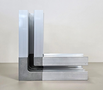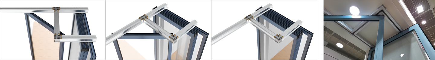 Rail connection component used when changing panel direction in L-shape. Useful for rotating or storing panels in corner spaces
