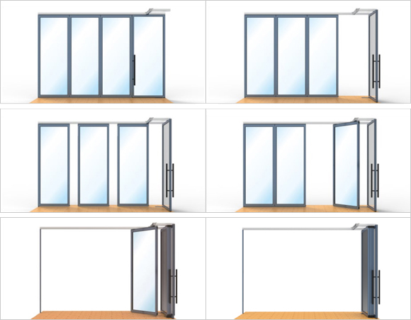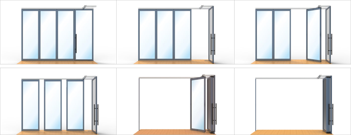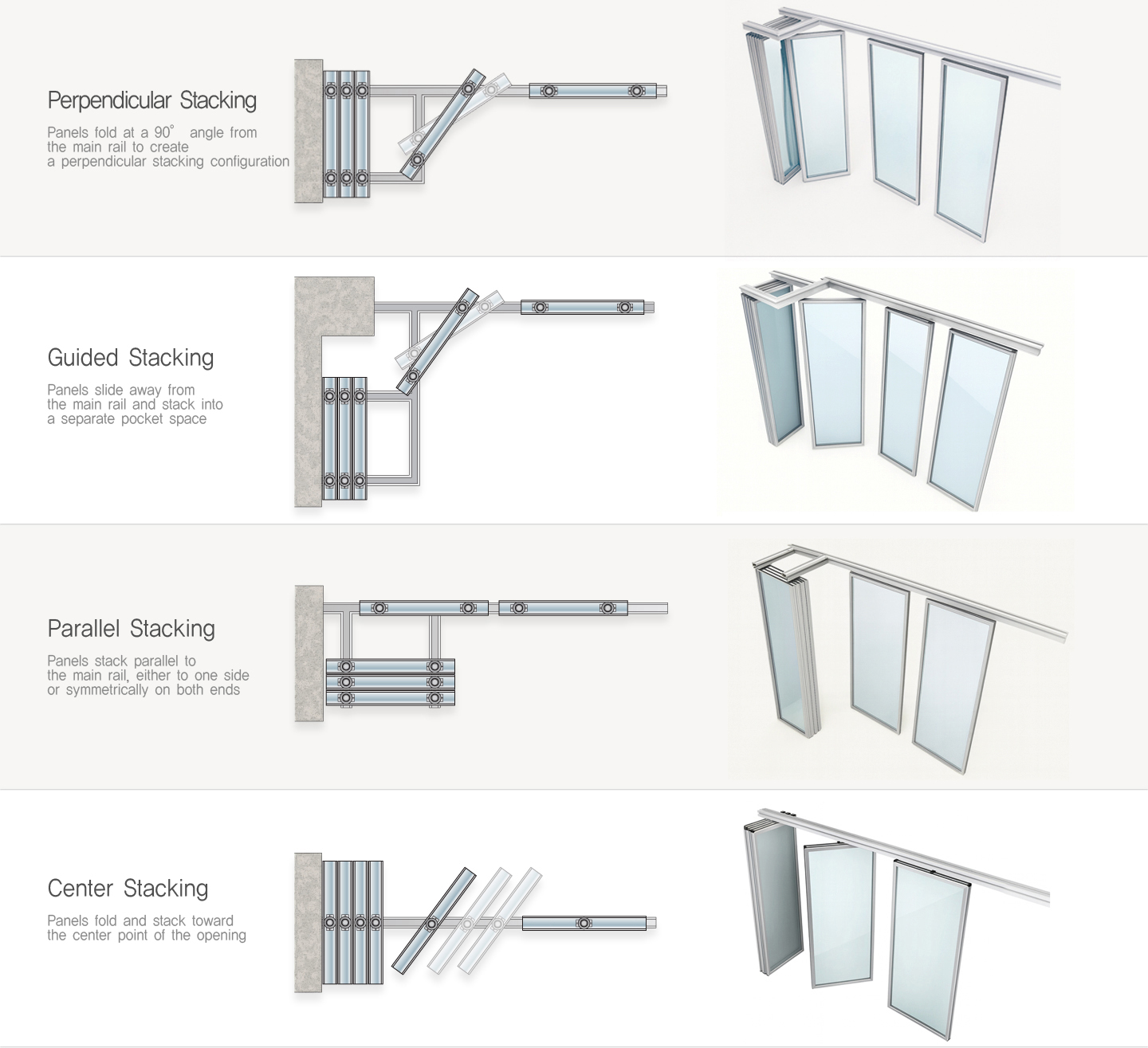 Unlike folding doors, the Frame Moving Wall operates by individually moving and storing each door panel. Each panel independently moves along the ceiling track, and when not in use, they are stored sequentially one by one in a designated pocket space.