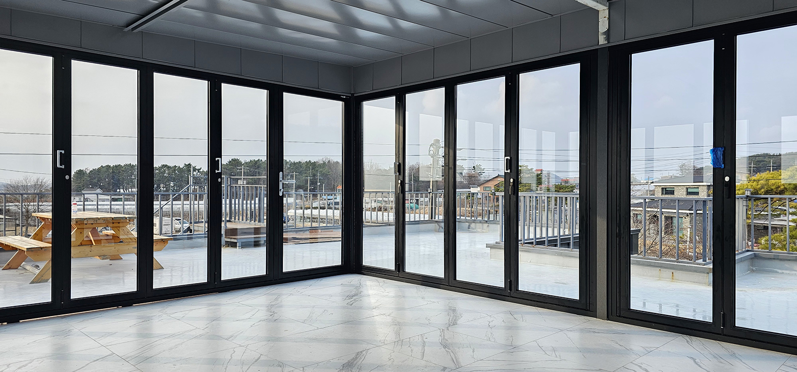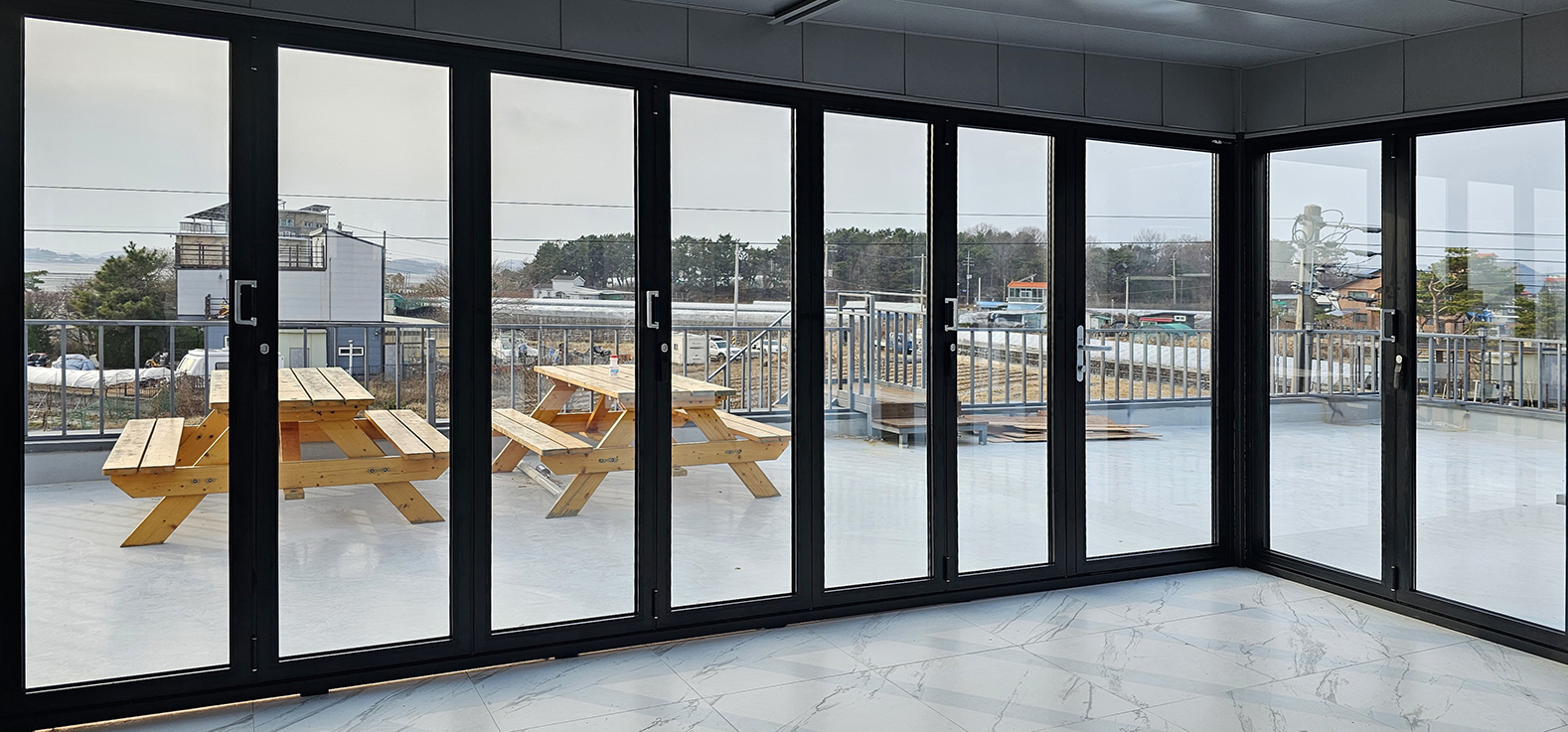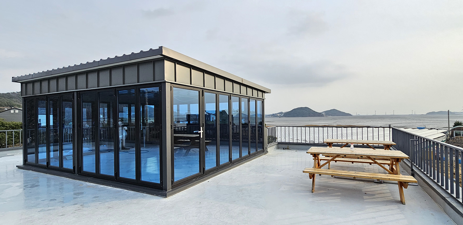 안산 대부도 전원주택 옥상에 썬큰 폴딩도어를 시공한 사례입니다. 기존에는 아무것도 없는 넓은 옥상 공간이었지만, 폴딩도어 설치를 통해 외부와 분리된 독립적인 공간으로 탈바꿈했습니다. 필요에 따라 완전히 개방하거나 닫아 사용할 수 있어 활용도가 크게 높아졌으며, 실용성과 디자인을 동시에 갖춘 공간으로 완성되었습니다.