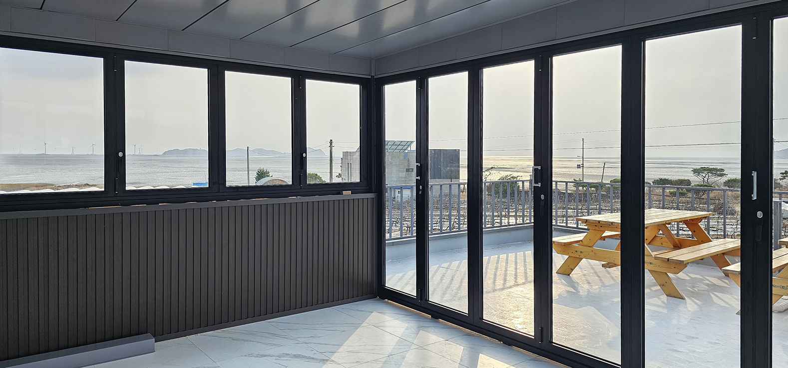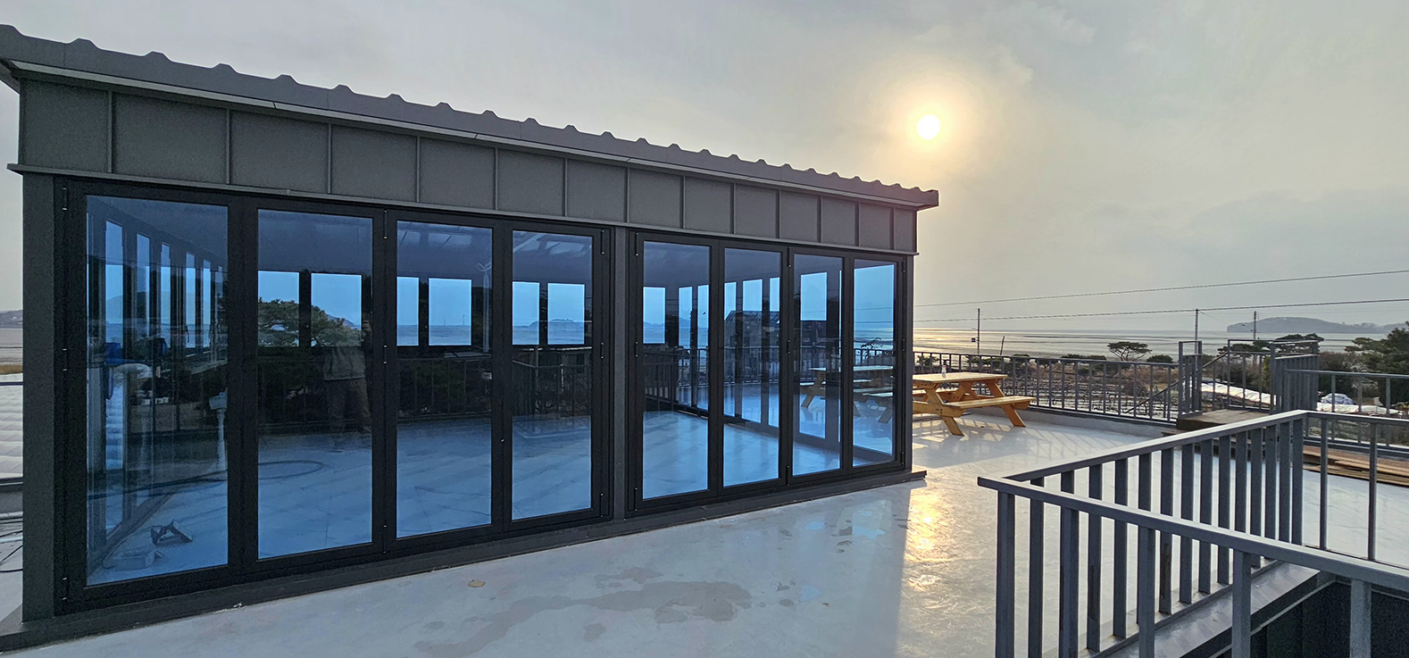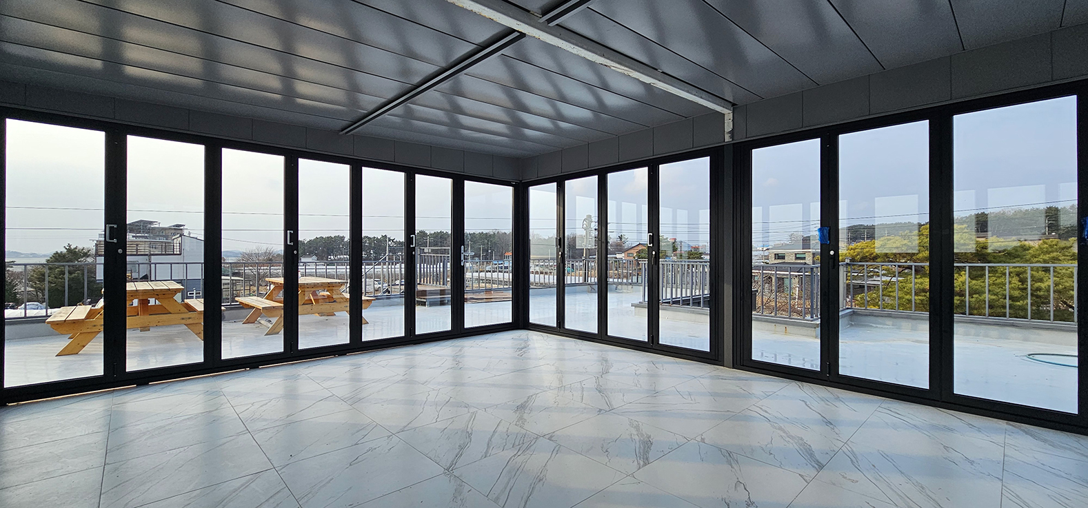 안산 대부도 전원주택 옥상에 썬큰 폴딩도어를 시공한 사례입니다. 기존에는 아무것도 없는 넓은 옥상 공간이었지만, 폴딩도어 설치를 통해 외부와 분리된 독립적인 공간으로 탈바꿈했습니다. 필요에 따라 완전히 개방하거나 닫아 사용할 수 있어 활용도가 크게 높아졌으며, 실용성과 디자인을 동시에 갖춘 공간으로 완성되었습니다.